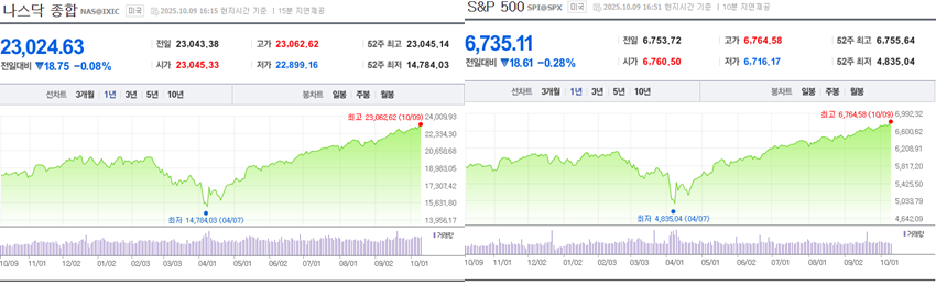 S&P500은 6,735pt(-0.28%), 나스닥은 **23,024pt(-0.08%)**로