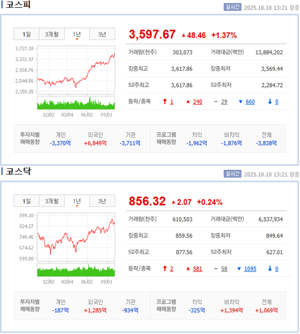 코스피는 3,597.67(+1.37%), 코스닥은 856.32(+0.24%).
