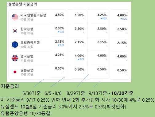| 🇺🇸 미국 | 4.0% (-0.25%) | 10/30 인하(2회 누적), 완화 사이클 진입 |