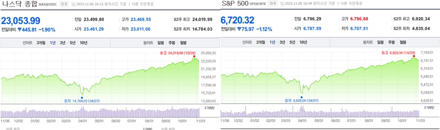 | 🇺🇸 나스닥 | 23,053.99 | ▼454.81 (-1.90%) | 고점 이후 조정, 기술주 차익실현 본격화 |