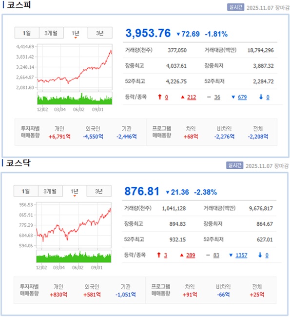 | 🇰🇷 코스피 | 3,953.76 | ▼72.69 (-1.81%) | 외인·기관 매도, 개인 방어 |