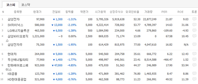 | 삼성전자 | 97,900원 | ▼1.31% | 11만원 돌파 후 조정 |