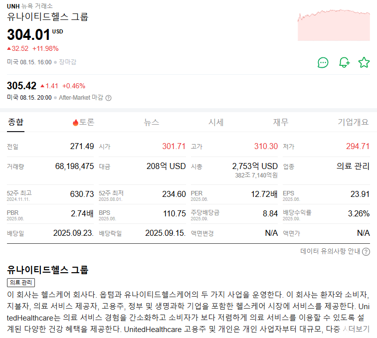 - 버크셔 해서웨이가 $1.6조(약 1.57B 달러) 상당의 지분을 매입했다는 소식에 UNH 주가는 시간외 시장에서 약 12% 이상 급등했다.