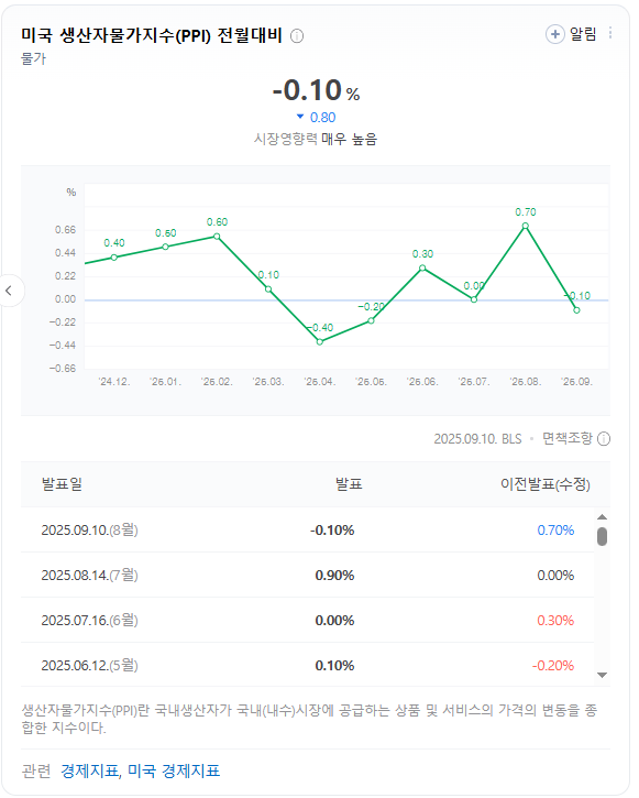 8월 생산자물가지수(PPI)는 전월 대비 –0.1% 하락(예상 +0.3%).